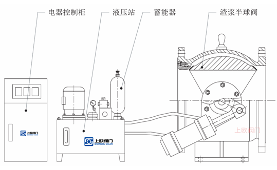 蓄能式液壓系統(tǒng)結(jié)構(gòu)緊湊,可置于閥門聯(lián)接架上或置于閥門附近,由液壓站、液壓缸和電氣控制箱組成。