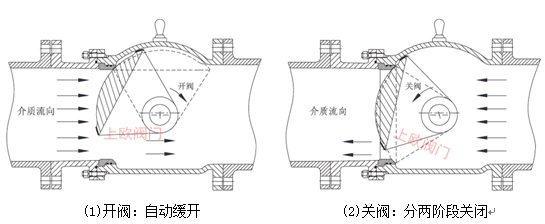 4、不積渣、零水損:如下圖所示,閥門采用全流道設(shè)計,當閥門全開時,半球形閥芯處于流道一側(cè),不占用流道空間阻礙流體的通過,不易產(chǎn)生積渣與渦流,特別適合含渣量高與流速高的"雙高"介質(zhì)。