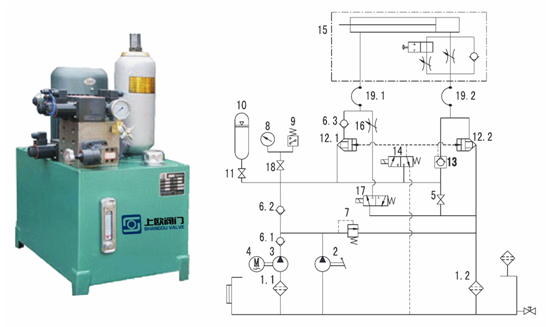1、濾油器2、手壓油泵3、柱塞泵4、電機5、截止閥6、單向閥7、溢流閥 8、壓力表9、壓力控制器10、蓄能器11、截止閥12插裝閥13、液控單向閥 14、電磁換向閥15、三調(diào)節(jié)液壓缸16、節(jié)流閥17、電磁換向閥18、截止閥 19、高壓軟管