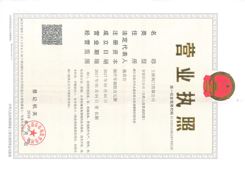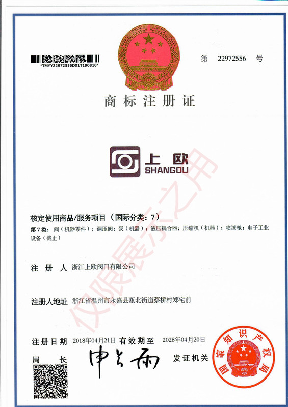 上歐閥門商標注冊證書